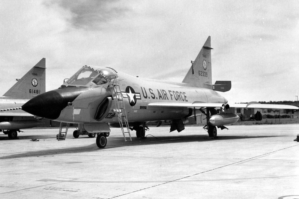 Convair TF-102A-41-CO (S/N 56-2339) of the 182nd Fighter Interceptor Squadron, Texas Air National Guard, Kelly Air Force Base, Texas, on May 1, 1965. F-102A (S/N 56-1481) is in the background. (U.S. Air Force photo)