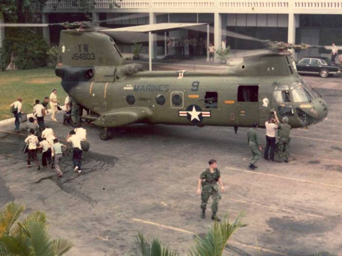 A las 7:53 de la mañana del 30 de abril de 1975, un helicóptero CH-46E Sea Knight del Cuerpo de Marines evacuó a los últimos marines guardias del tejado de la Embajada de Estados Unidos. No todos los ciudadanos que querían ser evacuados lo consiguieron. Muchos salieron como pudieron en pequeñas embarcaciones y fueron recogidos por buques de la Marina en las semanas y meses siguientes. El número total de personas que evacuaron y entraron en Estados Unidos fue de casi 140.000.