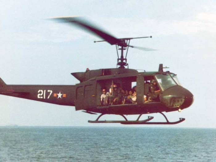 El 29 y 30 de abril de 1975, una flota de buques estadounidenses fue desplegada en el Mar de China Meridional, frente a la ciudad costera de Vung Tau, Vietnam, cerca de Saigón. Los helicópteros del Cuerpo de Marines, de la Fuerza Aérea Estadounidense y de Vietnam del Sur transportaron a los evacuados hasta los buques reunidos. El número de helicópteros era tan grande que algunos tuvieron que ser empujados por la borda para permitir que otros aterrizaran, una imagen que quedó grabada en la cultura popular.