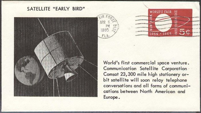 El 28 de junio de 1965 entraba en servicio el Intelsat I, conocido como Early Bird, primer satélite comercial de comunicaciones en órbita geosíncrona. Early Bird fue lanzado el 6 de abril de 1965 desde Cabo Kennedy a bordo de un Delta de empuje aumentado, una primera etapa Thor con tres motores de combustible sólido TX-33-52 ensamblado por Douglas. Inicialmente, se situó en una órbita elíptica. El motor de apogeo se encendió en la sexta órbita, colocándolo en una órbita circular a una altitud aproximada de 37.000 km. Durante las semanas siguientes se realizaron exhaustivas pruebas operativas del satélite y de los sistemas terrestres.