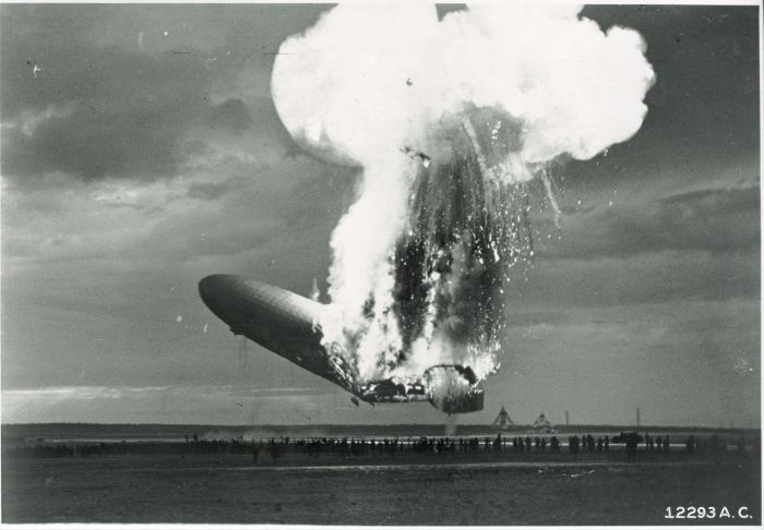 La llegada del Hindenburg el 6 de mayo se retrasó varias horas para evitar una línea de tormentas que pasaba sobre Lakehurst, pero alrededor de las 19:00 h, el dirigible recibió autorización para su aproximación final a la Estación Aérea Naval, que realizó a una altitud de 200 m, bajo el mando del capitán Max Pruss. A las 19:21 h, se lanzaron dos líneas de aterrizaje desde la proa del buque, que fueron sujetadas por el personal de tierra. Cuatro minutos después, a las 19:25 h, el Hindenburg estalló en llamas y se precipitó a tierra en poco más de medio minuto. De los 36 pasajeros y 61 tripulantes a bordo, 13 pasajeros y 22 tripulantes murieron, así como un miembro del personal de tierra, lo que supuso un total de 36 vidas perdidas.