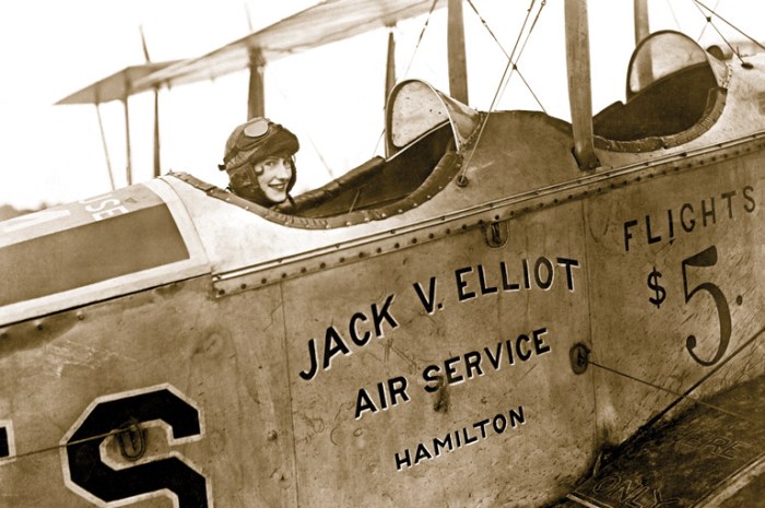La piloto Eileen Vollick en la cabina del Curtis JN-4 que pilotaba para Jack Elliot Air Service en Hamilton. Primera mujer con licencia de piloto en Canadá el 9 de junio de 1927.
