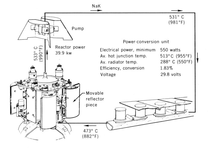 Su fuente eléctrica nuclear, formada por elementos termoeléctricos, debía producir más de 500 vatios de energía eléctrica durante un año. Al cabo de 43 días, un regulador de tensión de a bordo de la nave – sin relación con el reactor SNAP – falló, provocando la parada del núcleo del reactor, tras alcanzar una potencia máxima de 590 vatios. Tras el fallo del sistema de 1965, el reactor quedó en una órbita terrestre de 1.300 km con una duración prevista de 4.000 años.